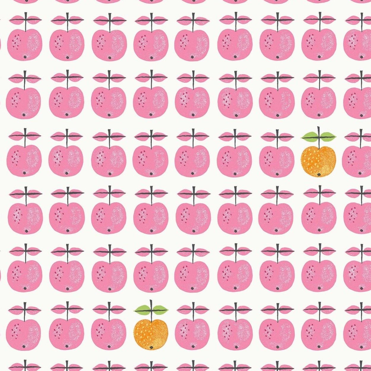 Дизайн из популярной серии фарфора 1960-х годов Стига Линдберга теперь украшает наши экологичные флизелиновые обои Pall Sachet Pink. На белоснежном фоне ровными рядами расположены игривые стилизованные яблоки вишнево-розового цвета, а редкие желто-оранжевые яблочки создают живой контраст.